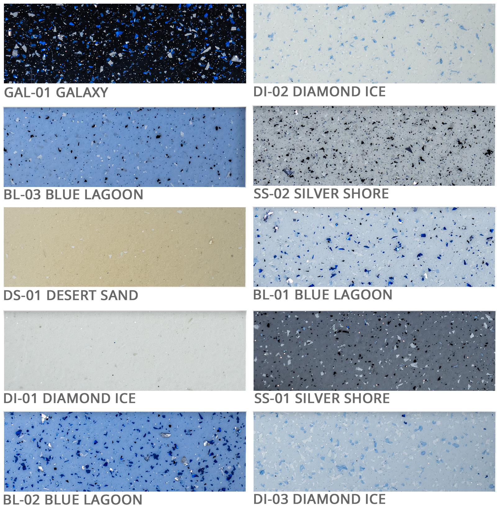 Zur Auswahl stehen 10 ansprechende Farben mit unterschiedlichen Anteilen an Flakes.
