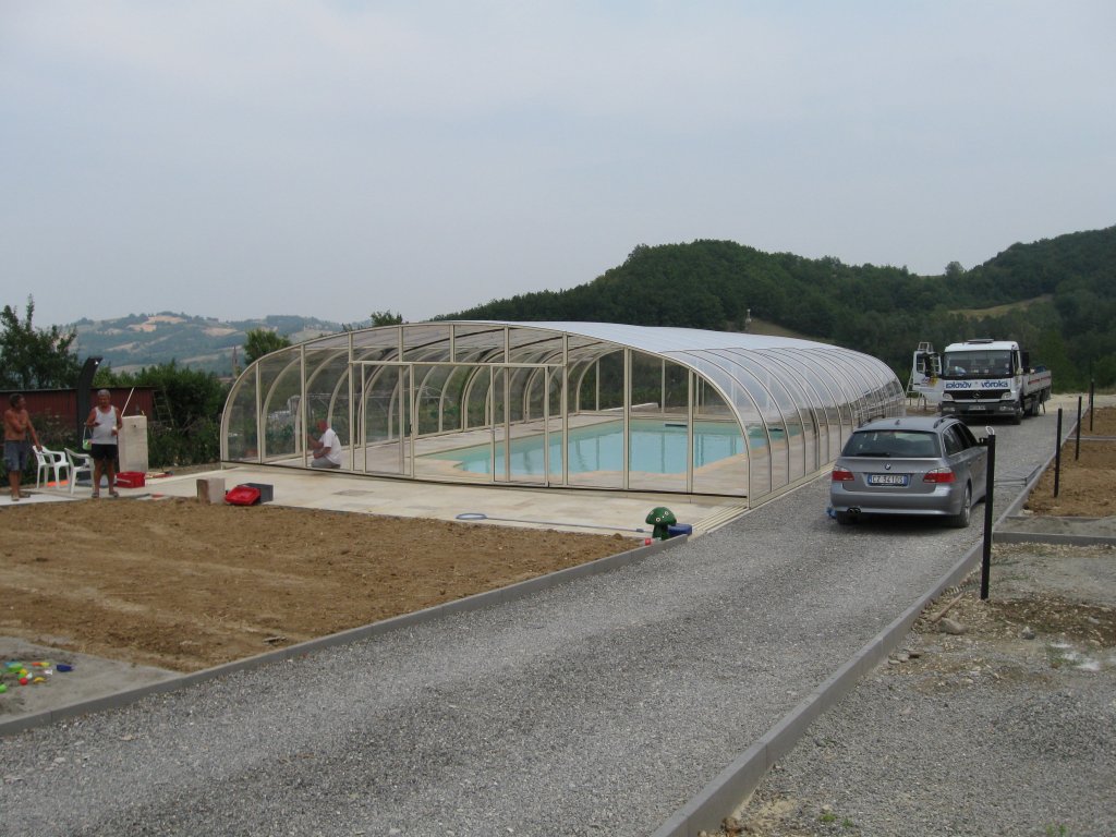 • Laufschienen und Profile in verschiedenen RAL Farben (durch Pulverbeschichtung für höchste Widerstandfähigkeit) Dachfläche und Stirnwände aus massiven und glasklaren Polycarbonat Stirnwände